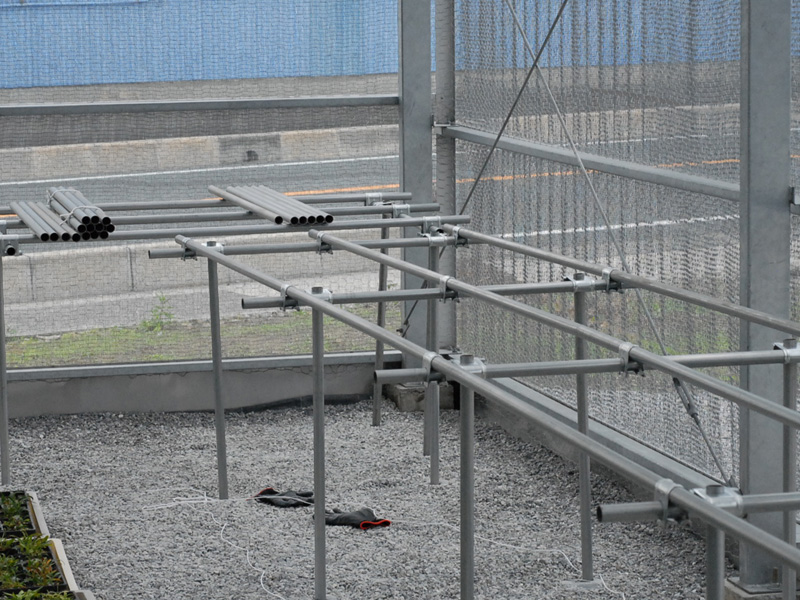 新宮で棚を作った時は48ミリの単管パイプでつくりましたが、連結パーツが高いので、今回は25ミリパイプで作ってます。若干しなりますが作場としては十分でしょう。