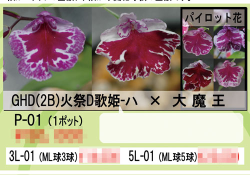 大魔王の交配内容が「来光歌姫×魔王」ですから、歌姫の血が隔世遺伝で出て僅かな確率で大魔王のような花全体に紅点が広がる花となりました。「GHD(2B)火祭D歌姫」を交配親に使うことで歌姫芸が隔世遺伝で出るのに加えて花粉に大魔王を使っているため高確率で大魔王タイプ、進化系歌姫が出る交配です。先行ビン出し品のパイロット花もけっこういい花が出てます。