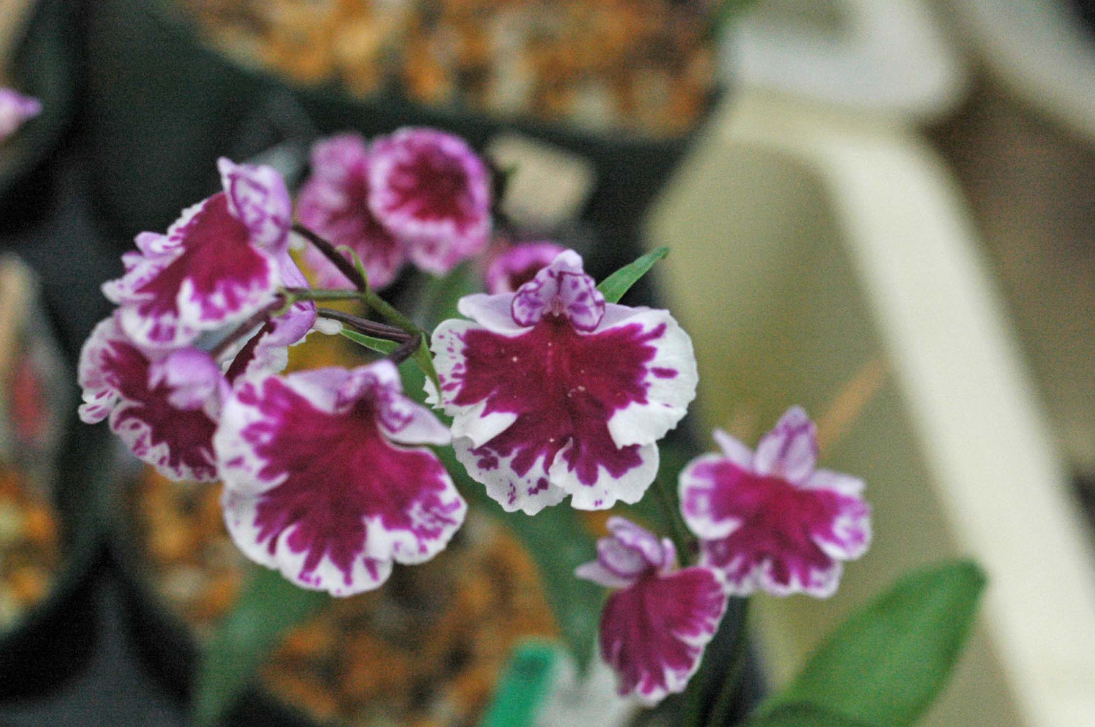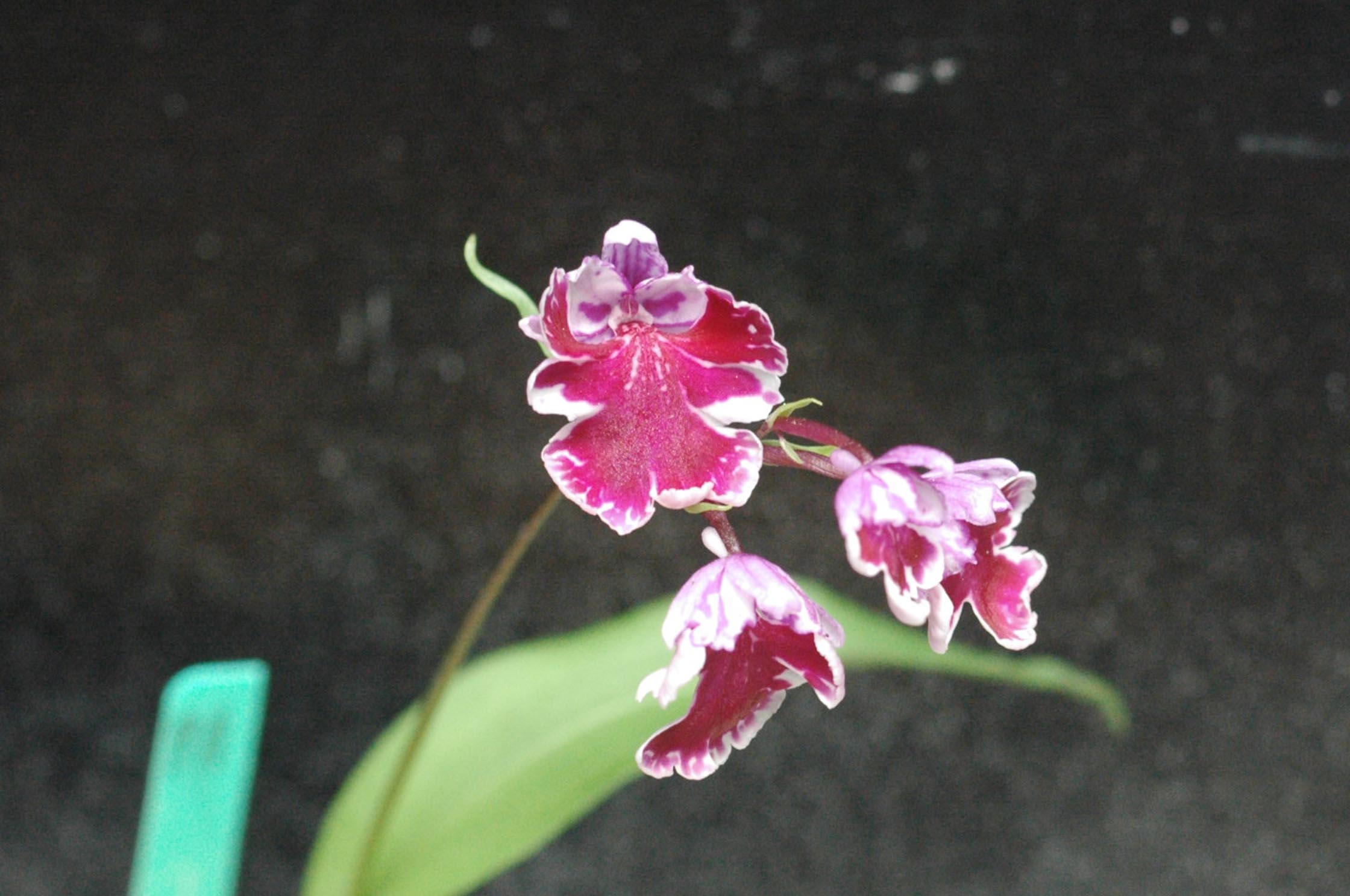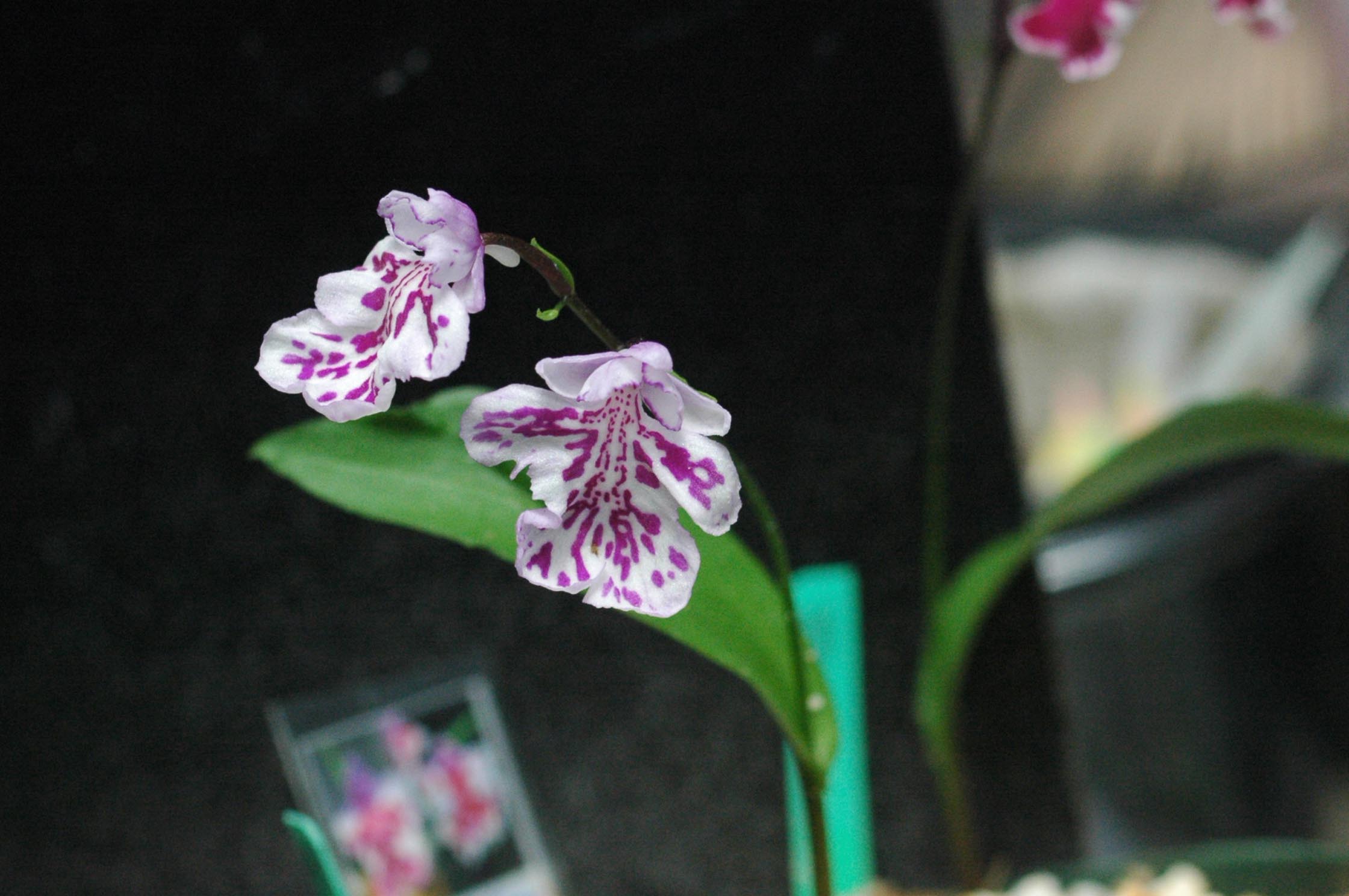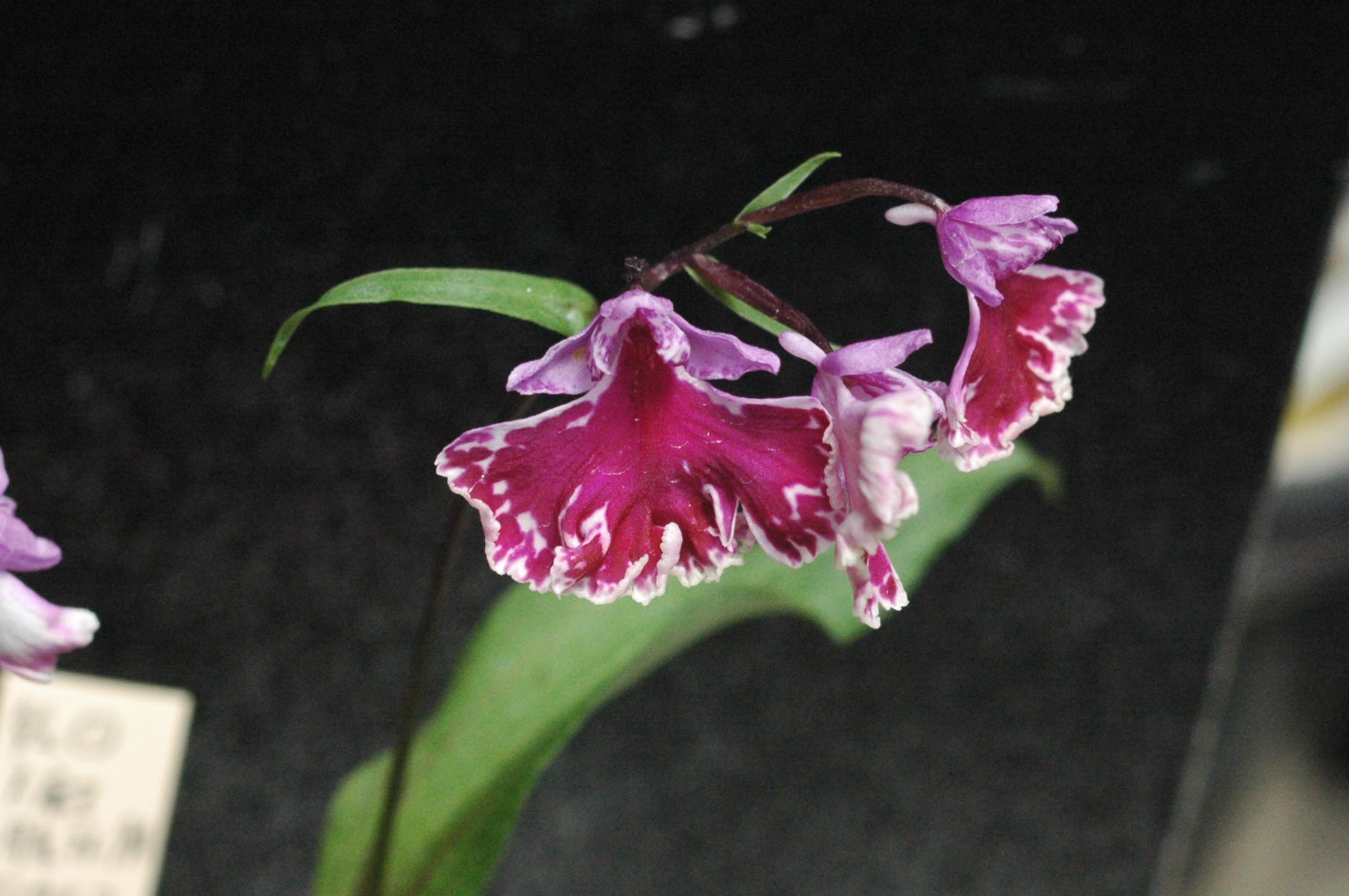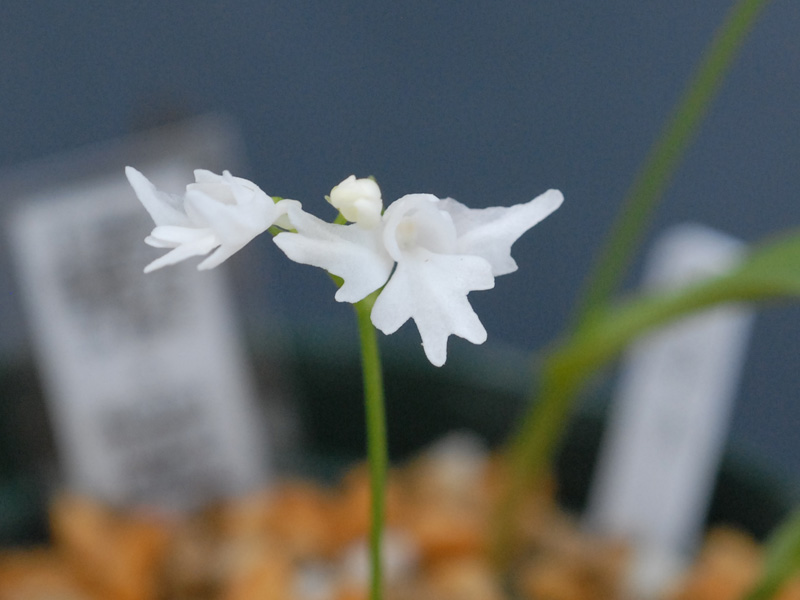 一見両方とも白韋駄天獅子ですが、上は学宝交配からの完全純白系の白韋駄天獅子、下はピンク韋駄天獅子を作出しするための副産物で出てきた見た目が白韋駄天獅子。要するにピンク無点韋駄天獅子となります。ピンクは基本的に地色が白く、花粉塊も黄色、子房と軸に色味がないので、ピンク無点になると見た目は白に見えます。白韋駄天獅子とピンク系白韋駄天獅子を並べても人間の目には見分けがつきません。花形はピンク系韋駄天獅子のほうがいいですけどね。