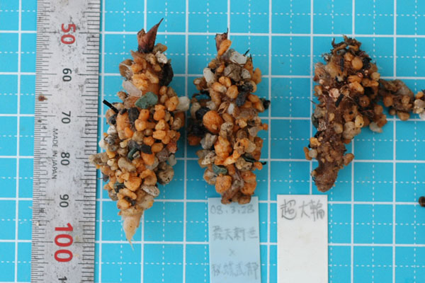 極めつけは3号鉢に一本植えの大麒麟。球根は5cmオーバー、芽を含めると6cmにもなりました。底のゴロ土にあたり下部はグニャリと曲がっています。まっすぐ伸びればもっと長かったかな。ここまでデカくなったのは初めてで、春の開花が待ち遠しくなります。