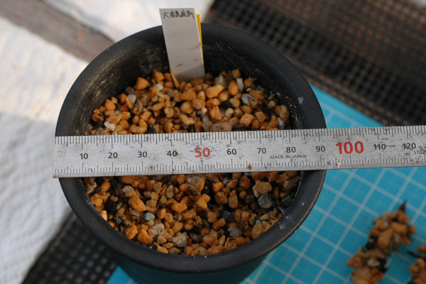 下の写真は実際植えていたポットで、3号鉢といっても普通のプラ鉢です。土は一般的なウチョウラン用土より荒めで、水はけや通気を考慮しています。鹿沼の微細など細かな砂でも灌水加減で問題なく育つとは思いますが、私の灌水方法だと3~5mmぐらいの粒がいいようです。