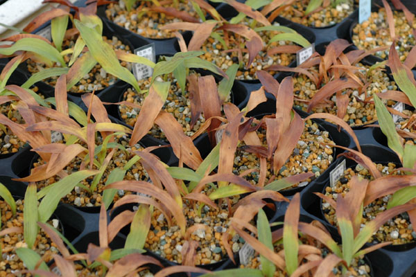 交配の種類によって早く枯れるものとほとんど変化のないものとがハッキリと分かれるのが面白いです。写真は隣り合ったトレーですが、一つは早くに紅葉して葉っぱも茶色に変色しています。もう一つは「まだまだ行けるぜ」と言わんばかりに元気です。鉢はカチカチなので球根は出来ているのでしょうけど、寒くなっても葉が青々としているものは球根ができてなかったりするのでこういうポットを見ると心なしか心配になります。