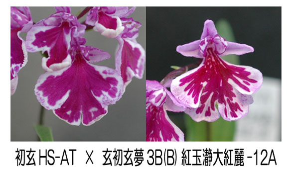 「紅玉瀞大紅玉麗」は中輪の大紅点タイプの花ですが、「玄初玄夢3B(B)」と交配でよくもまぁこんな寿光タイプの紅斑紋が咲いたものです。「玄初玄夢3B(B)×紅玉瀞大紅玉麗」は花形は大仁王タイプと寿光タイプの両方、紅点は散る一点系と散らない一点系両方が出るようです。交配相手にもよるのでしょうけど、「玄初玄夢3B(B)」は歌姫タイプと交配すれば、歌姫タイプ(寿光型の飛散紅斑紋)が多く出るかもしれません。