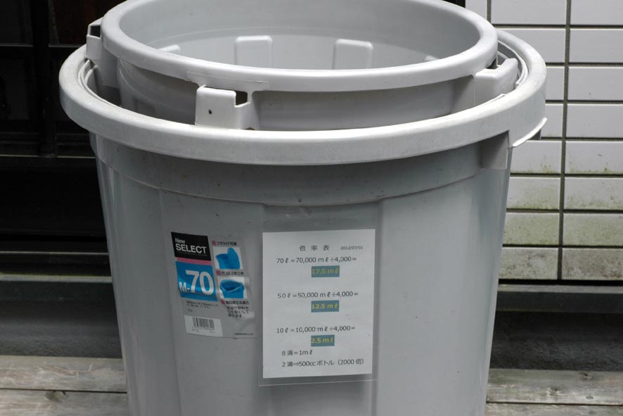 肥料やりです、70ℓと50ℓに作ります、薄めの肥料は植物にも
