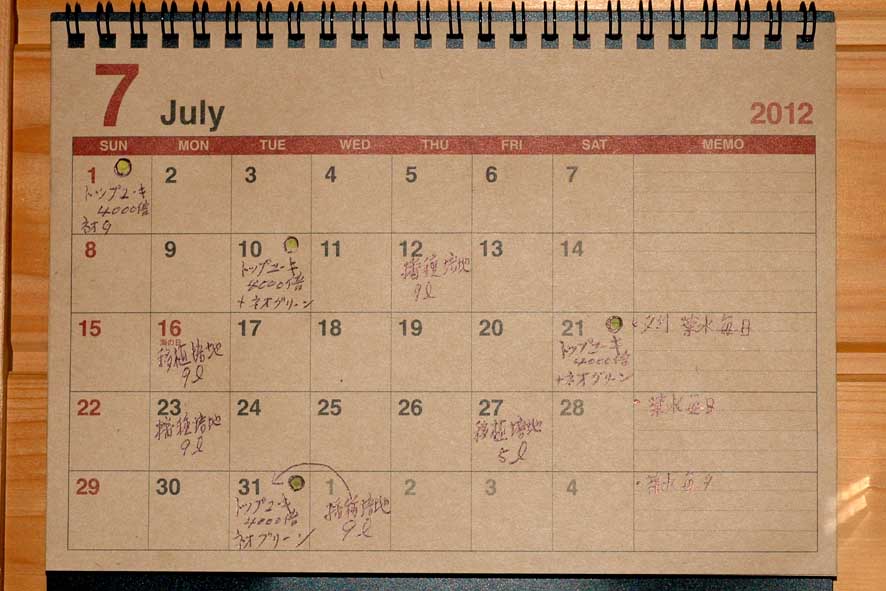 今日は約10日おきの肥料散布、今年から始めたかなり薄い