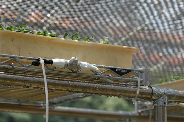 蘭舎も35℃程度になるので、急遽、水道に取り付ける噴霧器を取り付けました。15分の噴霧を一日6回して蘭舎の気温を下げています。だいたい2~3℃下がります。