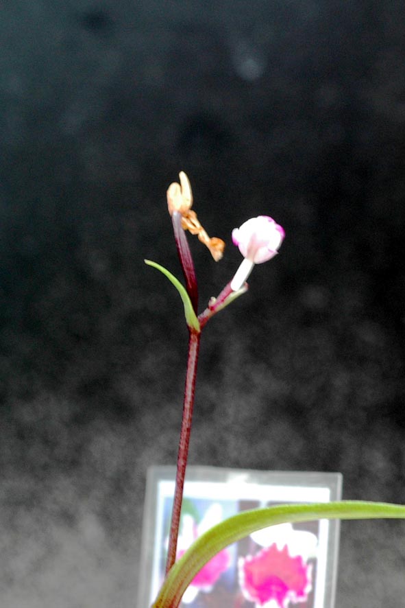 妻楊枝で交配の為開きました距と花粉塊は、まるでウチョウ蘭