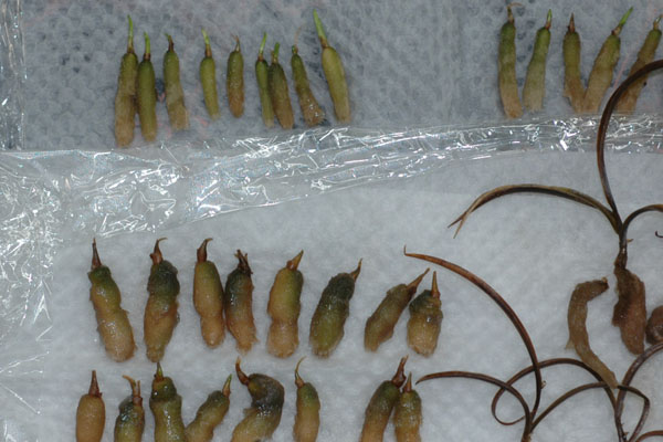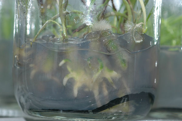 異常成長瓶の写真が出てきました。根が枝分かれしているのがわかると思います。根は球根ぐらいに太くなっていました。8本ほどですが、瓶内はすし詰め状態です。