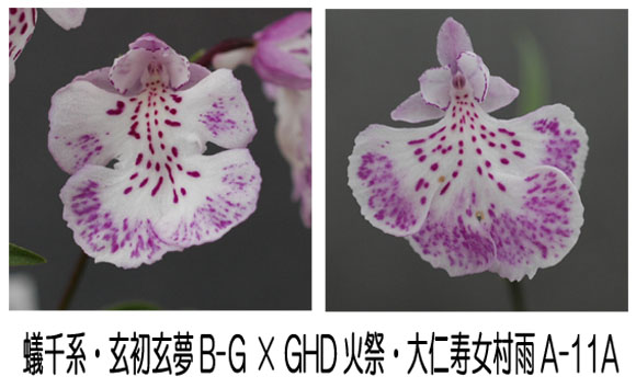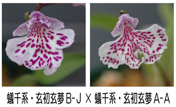 両親とも一点花が半分入っていますので、かなり一点花を意識した斑紋花の交配です。単純計算で1/4が一点花になるのですが、原種から数えてF5ですので単純に1/4一点花になるかどうかは不明です。こういう交配はリストに載せにくい(評価されにくい)ので、自分で楽しむ為の交配になりそうです。