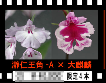 限定4本ですが、大麒麟タイプの獅子咲き狙い交配です。数が取れない交配なので、高額ボトルとなります。円弁の一点獅子が出るのは保障します。問題は瀞仁王獅子Aの二条紅点(ハート点)に似るか、大麒麟のような紅斑紋や大紅点になるかどうかというところです。どちらの紅点も強そうな感じですので、どうなるかが楽しみなところです。大麒麟は赤鬼交配をかけても半分は大麒麟タイプや仁王タイプ大紅点が出ましたので、相当強い血だと思われます。