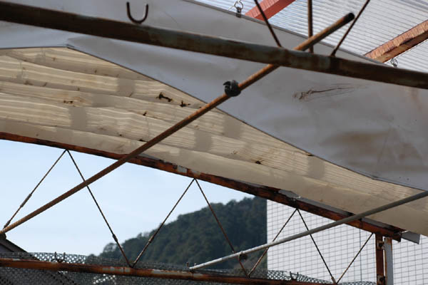 以前は離れの作場の屋根は可動式のテントでしたが、劣化で雨漏りしまくるため、大工さんに頼み2月に波板を張ってもらってました。古いテントはそのままだったので、テントを撤去し蘭ネットを張る作業に3日もかかってしまいました。蘭ネットの1枚は屋根に固定し、テントの代わりに蛇腹に可動する蘭ネットを取り付け遮光を二重にできるようにしました。