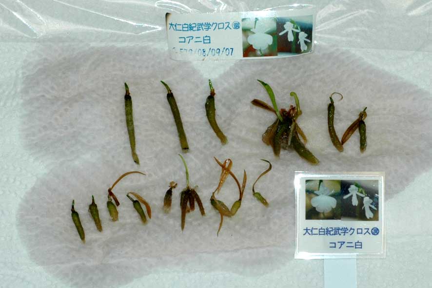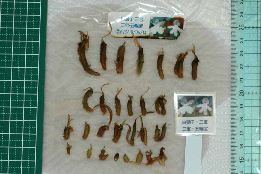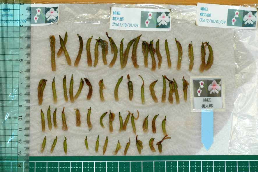 同じ母体に同じ花粉で交配した2鞘分の結果です。白キャップしている方と黒ゴム栓はそれぞれの鞘の発芽の状態です。