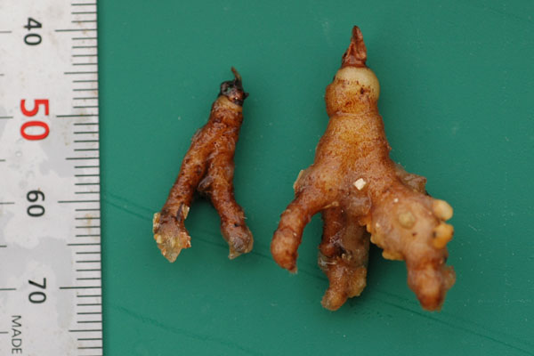 同じ交配品の酔白一点の選別品の球根ですが、左は二又、右はなんと四又に分かれた球根です。同一品かは不明です。二又や三又は見たことあるけど、四又はさすがにお目にかかったことないです。一見三又に見えますが、よ~く見ると真ん中が二つに分かれて密着しています。すごいなこれ。ロケットのように自立するかと思いましたが、バランス悪く自立しませんでした。本当は自立した写真を載せたかった。