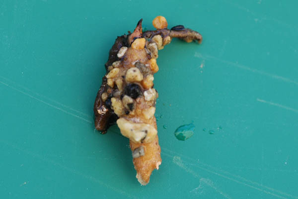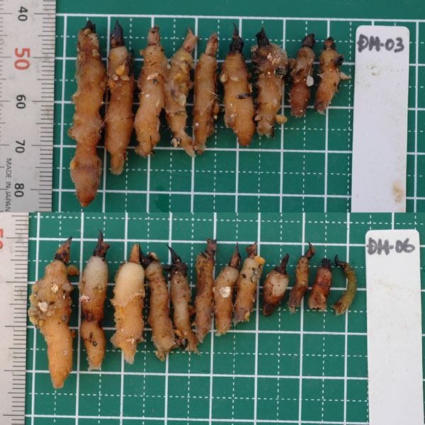 先日紹介したポットの掘り上げた結果です。DM-03は9球、DM-06は12球でした。DM-03は5本から9球なので、分球率1.8倍でほぼ1本から2球になっています。DM-06は6本から12球なので単純に1本から2球づつの2倍。どちらもいい成績だと思います。リン、カリ入りの粒々用土が入っているものを使ったので、約2倍になっていますが、粒々用土が入っていないものは、それほど分球していませんでした。だいたい1.2~1.5倍ぐらいでしょうか。グリーンキングにはカリ分が少ないですし、やっていた液肥もずいぶんと薄いものだったので完全なカリ不足ですね。大きさも親球±ぐらいの大きさでした。