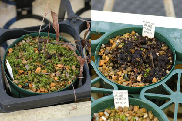肥料と植物の吸収のバランスが崩れるとコケが発生したり、表面に黒い藻のようなものが発生しやすくなります。もともと腰水なので、下からの通気はほとんどなく、コケで上部をフタされると、全くといっていいほど通気がありませんから、作が悪くなるのだと思います。ウチョウラン用土より若干荒めの土で通気も考えた用土の方が作がいい気がします。これは腰水栽培でのことですので、栽培方法で用土の考え方は変わってくるのだと思いますが・・。