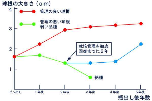 毎年植え替えをして適量の肥料を与えなど管理が良いと年々球根がおおきくなっていきます。管理が悪かったり、もともと弱い品種だったりすると、だいたいビン出し3年で絶種します。