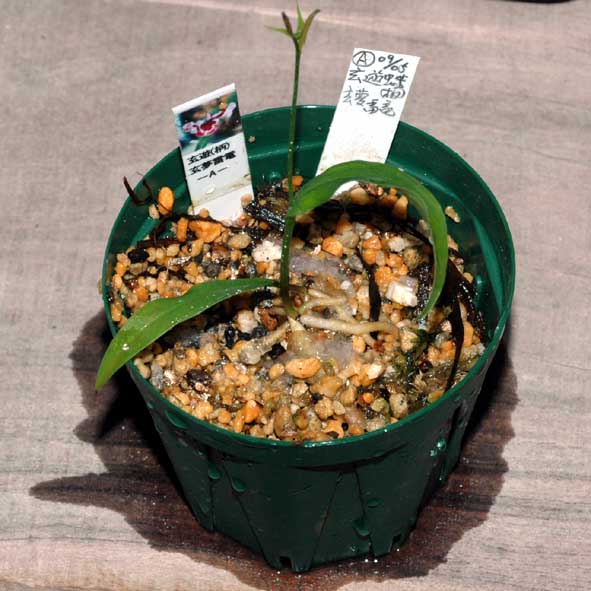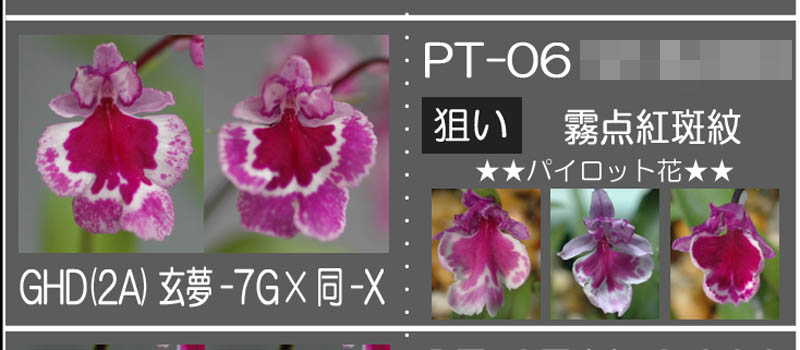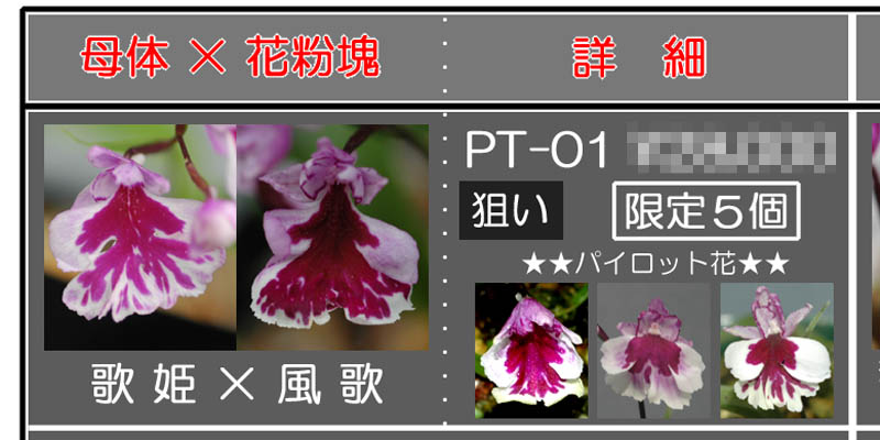 今回はいきなりのド本命!「歌姫×風歌」 歌姫斑紋間違いなしの交配。パイロットが4花咲いてそのうち2花が歌姫斑紋(写真の右と左)、1花が紅斑紋(写真中央)、残り1花が歌姫斑紋か紅斑紋か微妙な花(写真掲載なし)でした。4花咲いたパイロットから推測して半分ぐらいは歌姫斑紋が期待できそうです。歌姫斑紋の出る確率はほかの歌姫交配より格段に上です。