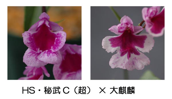 「HS・秘武C(超)」はかなりの大輪で、霧点が中心から外にむかってぼかすように入るちょっと変わった花。受咲きになるのが欠点かな。まぁ大麒麟とかけときゃ間違いないっしょ、ということで交配。大輪の大紅点が出るのは間違いなさそうで期待はするがちょっとノープランな感じも。