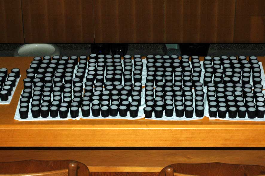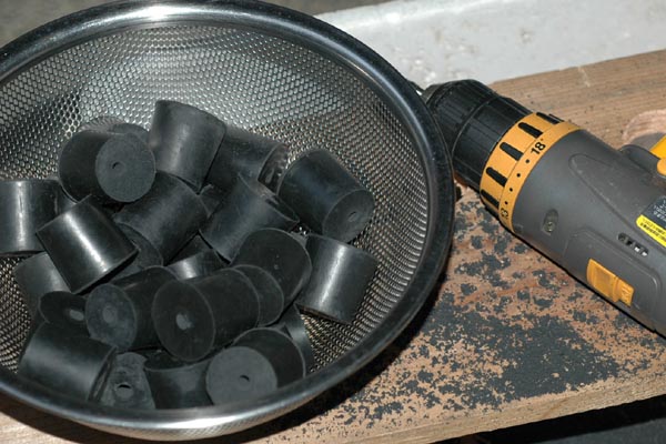 日が暮れてからゴム栓に穴をあける作業をしました。1時間半で60個程度、きれいに穴を開けるには案外時間がかかります。最初始めたころは指でゴム栓を抑えていたので、すぐに水ぶくれになっていましたが、人差し指と親指で輪を作るようにゴム栓を抑えるとダメージは少なくなります。地味な作業ながら大変です。