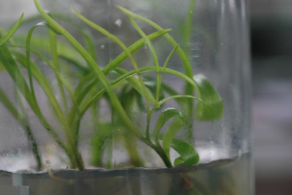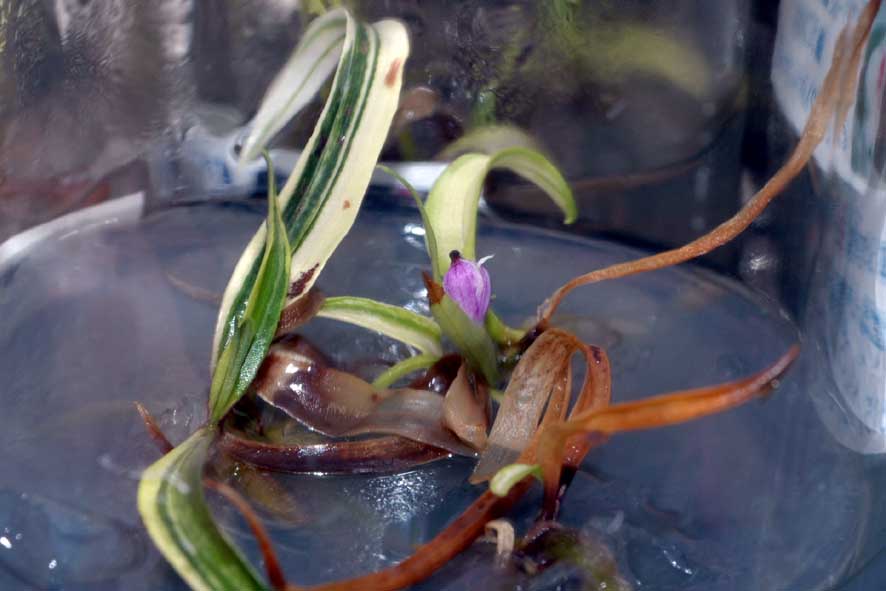 フラスコ内の岩千鳥は葉数は2、3枚ですが、この交配に限っては5~6枚ぐらい出る個体がありウチョウランのよう。華菊セルフを交配に使ったものですが、花弁が割れる特徴が葉にも影響するのか?どうなのか?