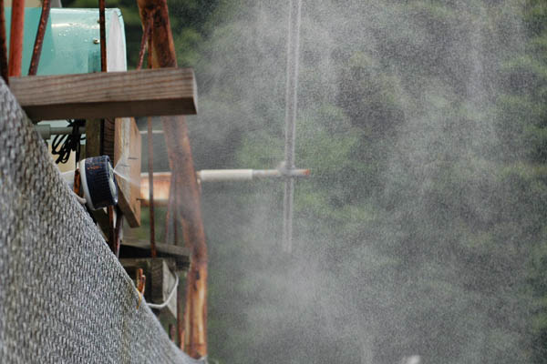 本日の12:30頃の蘭小屋の気温は34℃以上になってました。屋根や床に水をまき、小屋全体的にホースでキリを吹きかけると32℃以下に気温は下がり、その差は2.3℃ほど。