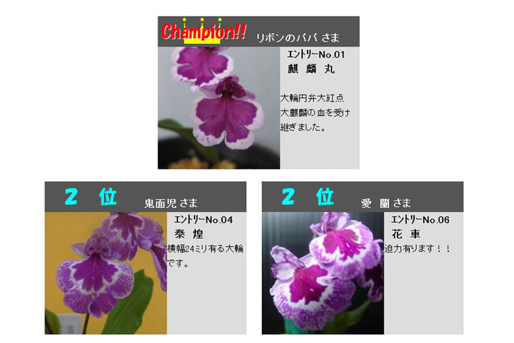 今回も リボンのパパさま がチャンピオンとなる結果でした。流石にお強い。2位は同票で 鬼面児さま と 愛蘭さま でした。