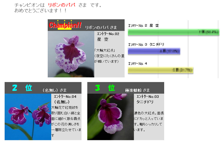 結果はリボンのパパ様の「星 空」が見事チャンピオンに輝きました。おめでとうございます。