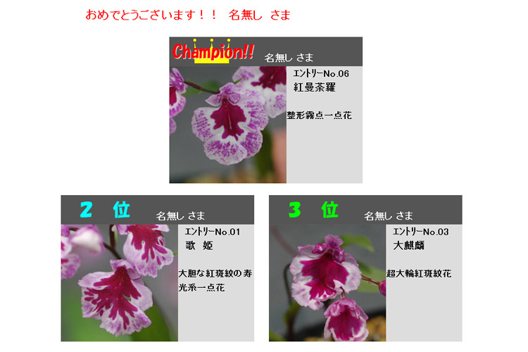 結果は紅曼陀羅がチャンピオンとなりました。歌姫か大麒麟だろうと思っていたから、ちょっと意外でした。