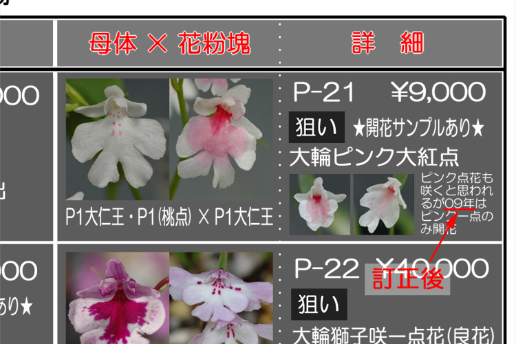 P-21 P1大仁王・P1(桃点)×P1大仁王 の欄の初花開花の説明文
