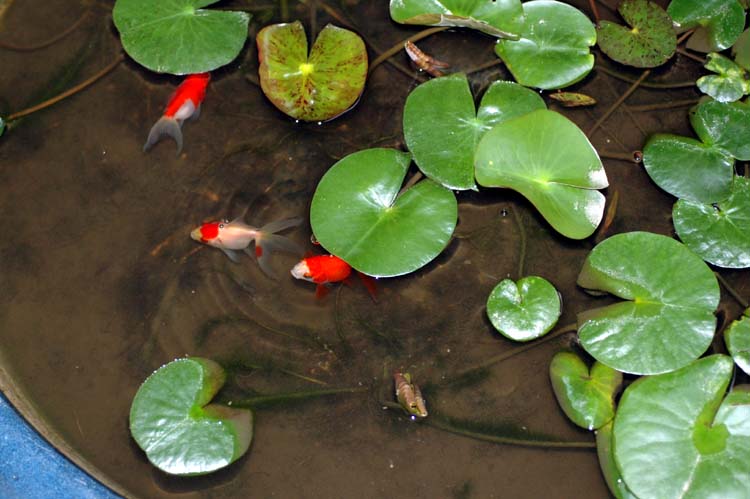 スイレン鉢にボウフラが湧くので息子が金魚を入れました