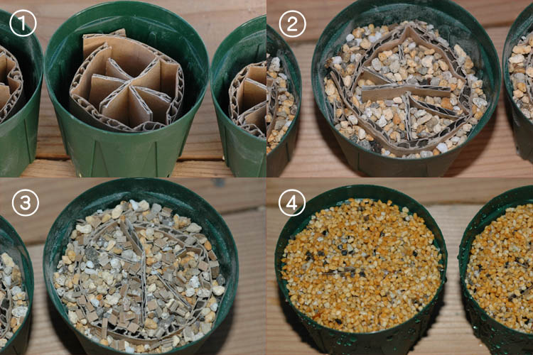 ④ その上に細かい鹿沼土と砂を混ぜた用土をダンボールが隠れるか隠れないか程度に薄く敷き詰め蒔き床の完成。
