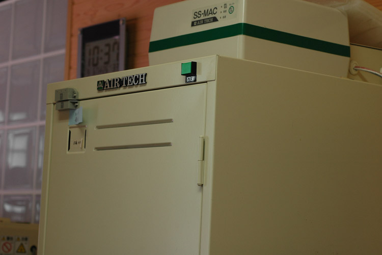 上部しか写真は撮ってませんが、クリーンベンチ用のフィルターが付いたロッカーです。本来は実験室用の白衣等を入れておくためのものらしいのですが、現在は培地のボトルが入っています。フィルターの電源をONにすることはなく、通常OFFのままですので、普通のロッカーでもなんら問題はありません。