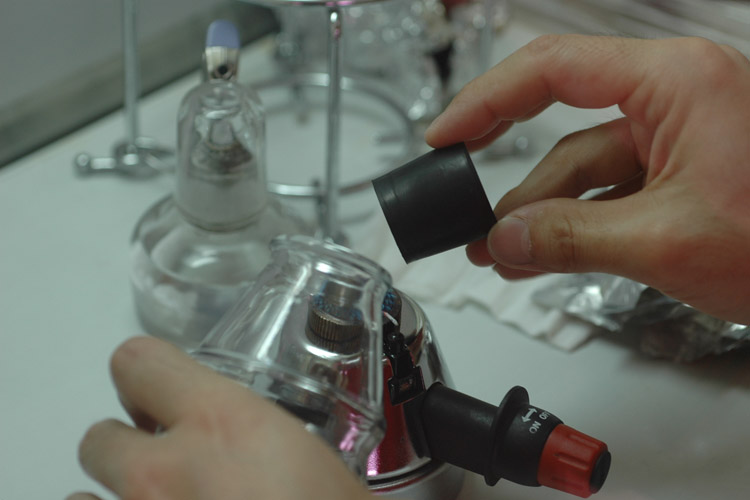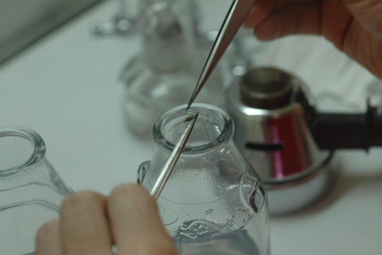 ビンの口とゴム栓をバーナーで殺菌の為あぶり、しっかりと栓をします。クリーンベンチのフィルターからの風で炎が思わぬ動きをして、指が熱いんだな、これが。たまに指の毛も焼けます。