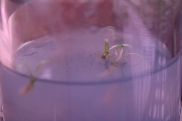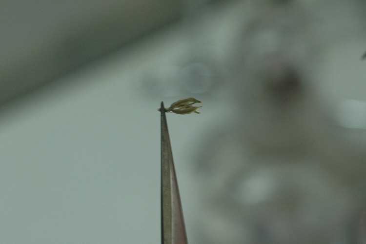 鞘が少し割れ、種が出てきたら、ピンセットで鞘をはじき種を培地に全体にある程度均一にまきます。