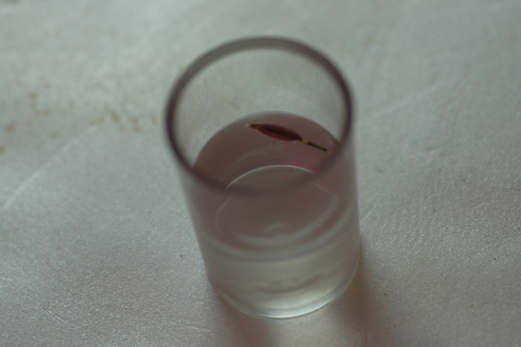 ピューラックスを2倍に薄めた溶液に切り取った鞘を浸します。大体10分程度でしょうか。だんだんと切り口が白く変色してきます。これもアルコールスプレーで消毒し、クリーンベンチ内に。