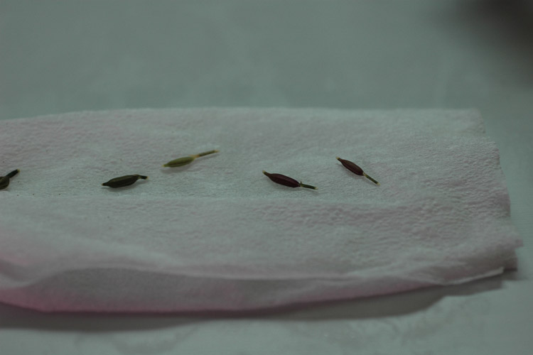 あらかじめクレーンベンチ内に用意しておいたキムワイプ(理化学用ティッシュ)にピューラックスで滅菌した鞘を並べ、余分なピューラックスを吸わせ乾燥させる。ある程度乾燥させないと湿ってパラパラと種がうまく蒔けない。