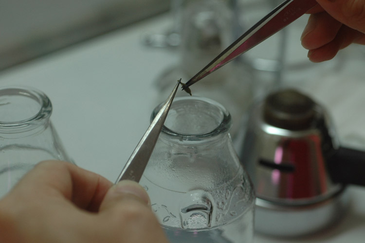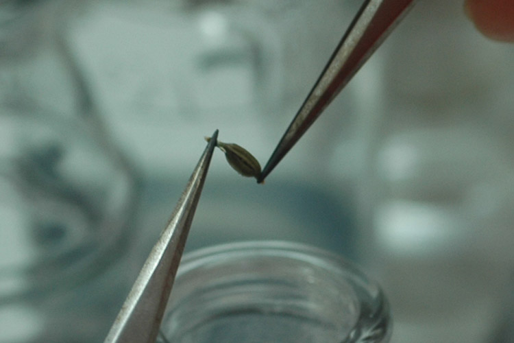 左手のピンセットで鞘を固定し、右のピンセットで鞘をはさみつぶすように鞘を割っていきます。ある程度押さえたら、パクッと鞘が割れ中から種が出てきます。