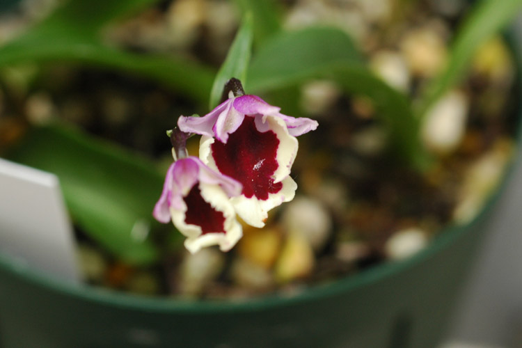 紅点が濃すぎて紅色というより、茶色(チョコレート色)をしています。肉厚で花弁がクリーム色をしていました。厚過ぎて完全には開きませんでしたが、交配親に使う分には問題ありません。