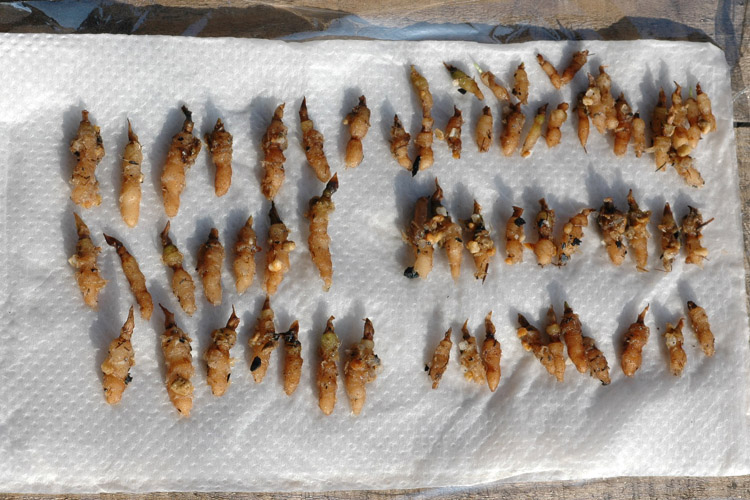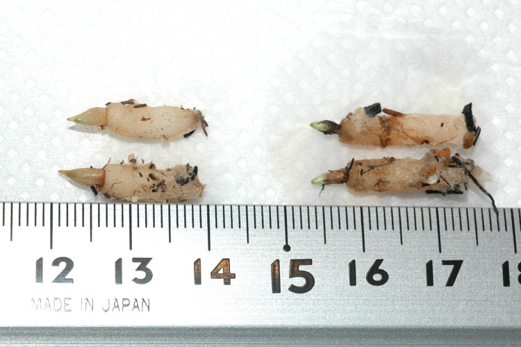 左側の1.5cm以下の球根と右側の1.5cm以上の球根どちらの球根が咲くかというと、左側の比較的小さい球根に花がつきます。右側は咲くか咲かないかは分かりません。 イワチドリは芽が出て、葉が広がると同時に花芽が出てくるので、球根の芽の部分にすでに花芽があると考えられます。よって、芽の部分がプックリと膨らんだ球根は花が咲くというわけです。 あと、球根の太さに注目すると、左側の球根の方が右側より太いことが分かります。 経験で太い球根の方が花が咲く可能性が高くなると思います。