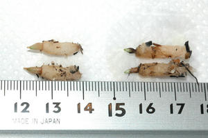 左側の1.5cm以下の球根と右側の1.5cm以上の球根どちらの球根が咲くかというと、左側の比較的小さい球根に花がつきます。右側は咲くか咲かないかは分かりません。 イワチドリは芽が出て、葉が広がると同時に花芽が出てくるので、球根の芽の部分にすでに花芽があると考えられます。よって、芽の部分がプックリと膨らんだ球根は花が咲くというわけです。 あと、球根の太さに注目すると、左側の球根の方が右側より太いことが分かります。 経験で太い球根の方が花が咲く可能性が高くなると思います。