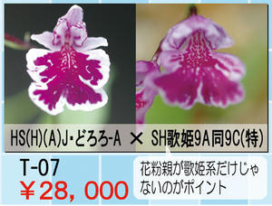 花だけ見ると大仁王系の紅斑紋に歌姫系をかけたように見えますが、おっとどっこい、花粉親の交配内容をよく見ていただきたい。詳しく分解すると「新世紀・飛天(A)×歌姫-9A」×「新世紀・飛天(A)×歌姫-9C」となります。花を見ると歌姫系に見えますが、大仁王系を経由している分どちらかと言うと「大魔王」に近い系統と思えます。(ちなみに「大魔王」を分解すると「来光・歌姫×魔王」) 「SH歌姫9A・9C-(特)」は両親に「歌姫」が入っている分歌姫よりになったのでしょう。要するに大仁王系が「来光」なのか「新世紀飛天(A)」なのかの違いですね。
