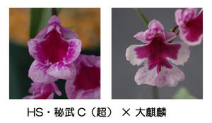 「HS・秘武C(超)」はかなりの大輪で、霧点が中心から外にむかってぼかすように入るちょっと変わった花。受咲きになるのが欠点かな。まぁ大麒麟とかけときゃ間違いないっしょ、ということで交配。大輪の大紅点が出るのは間違いなさそうで期待はするがちょっとノープランな感じも。