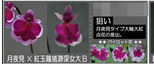 ベタタイプの大輪円弁花や「月夜見」タイプの花を作るための交配です。パイロット花を見る限りでは狙い通りにいきそうです。花粉親「紅玉鐘馗瀞深女大B」の影響で花形が悪くなるかと懸念していましたが、ほとんど円弁タイプになるようです。スペースの関係でリストに掲載出来るパイロット花には制限がありますので3枚しか載せていませんが、実際は10花ほど咲きました。特別悪い花がなかったのでけっこう狙い通りにいくかもしれません。パイロット花の写真を探して明日にでもブログにアップします。