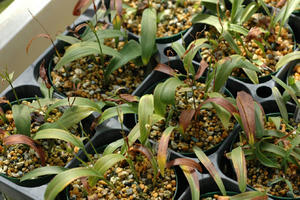 この写真は2012年春の写真で、販売品より1年早くビンから出したパイロットポットは写真です。中裂の短い花や極小さい花も咲いていますので、こういったのをこの春に選別しました。