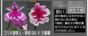 太軸の超大輪花が狙いです。「コリ大瀞美人・歌姫-9A」は大した花ではありませんが、「歌姫」の血が入っていることに注目したい交配です。この交配に歌姫芸が隔世遺伝でどう出てくるかがポイント。うまく歌姫芸がセットされたら大麒麟の超大輪とコリの太軸と歌姫の斑紋というすんごい花が出てくるやもしれません。