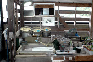 用土は左のザル籠から底土・大・中・右手前が小(上土)