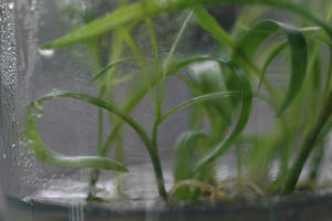 フラスコ内の岩千鳥は葉数は2、3枚ですが、この交配に限っては5~6枚ぐらい出る個体がありウチョウランのよう。華菊セルフを交配に使ったものですが、花弁が割れる特徴が葉にも影響するのか?どうなのか?