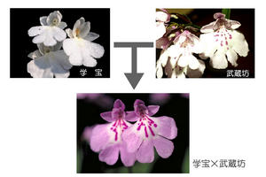 同じく、「学宝」と「武蔵坊」も交配します。 こちらも並点花が咲きますが、その中から花弁のしっかりした比較的大輪の花を大仁王系白花交配用(戻し交配用)に選別します。