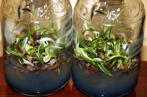 大きな球根を選別した4瓶は余り柄は出ていない中~小球植え