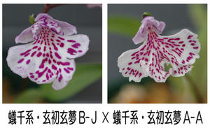 本日も斑紋花の交配です。「蟻千系×玄初玄夢B」では1本も寿光タイプは出ませんでしたが、「蟻千系×玄初玄夢A」では1/4ほど寿光タイプになりました。その寿光タイプを使った交配です。
